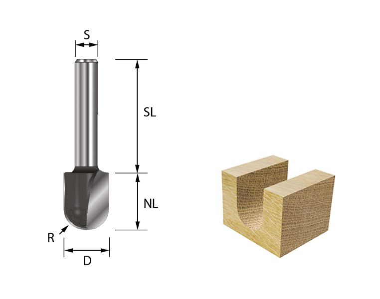 Fresa a raggio convesso a doppio taglio, un sottotipo di fresa a sgorbia senza cuscinetto a sfera, dal design lungo. La fresa a canale d'acqua è adatta a queste applicazioni:
