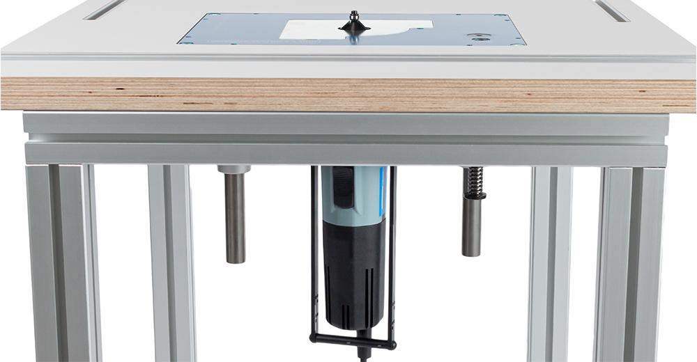 Se si desidera utilizzare il motore fresa sul Banco fresa, è necessario un sollevatore per fresa (ad esempio il sollevatore per fresa OFL2.0-AD43 per motori fresa o il sollevatore per fresa inclinabile OFL3.0) per sostenere il motore e regolare l'altezza. Grazie al mandrino della fresa che sporge verso l'alto, il cambio delle punte della fresa è facile e molto comodo.