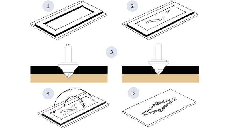 Il segreto è la speciale fresa per intaglio: la fresa con scanalatura a V è racchiusa da una guida conica a 45°. Durante la fresatura, la funzione di tuffo della fresa verticale viene sbloccata. Questo rende la scanalatura più profonda e più ampia quando la dima si apre. Quando la dima si rastrema di nuovo, la Fresa viene nuovamente sollevata e la scanalatura diventa di nuovo più stretta e meno profonda. Non potrebbe essere più semplice.