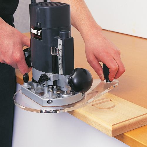 Con la piastra di adattamento 7-in-1 di Trend, 7 funzioni sono integrate in un'unica piastra di livellamento. Oltre alla lavorazione sicura dei bordi, va sottolineata la funzione di bussola per la fresa verticale e di guida parallela estesa.