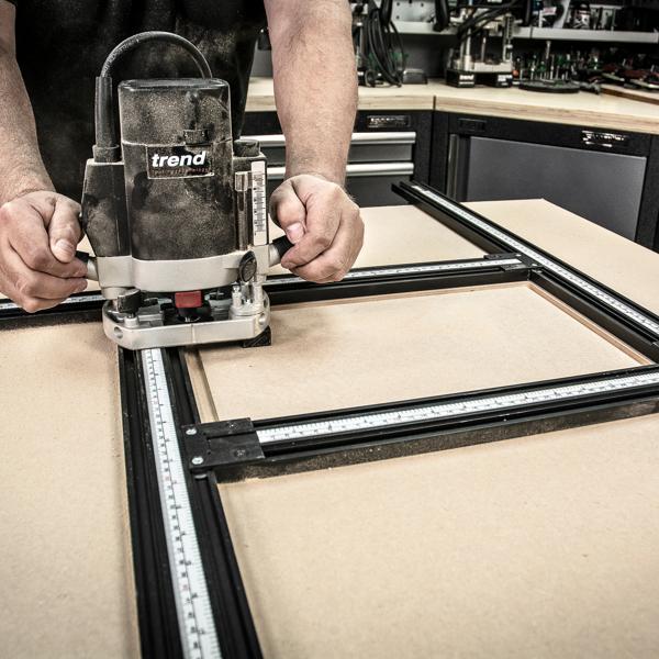 I profili della Sagoma di fresatura Varijig di Trend possono essere spostati liberamente l'uno rispetto all'altro. In questo modo si possono creare sagome di qualsiasi dimensione, quadrate o rettangolari. Impostazione veloce - fissaggio - inizio della fresatura - fatto!