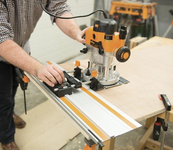 Triton offre binari di guida di varie lunghezze, che possono essere facilmente collegati e allungati con connettori per binari. Un buon fissaggio della guida è essenziale per ottenere tagli precisi. Anche se i gommini fissati tengono abbastanza bene, in modo che la guida non scivoli facilmente, le cose possono andare male, soprattutto con i tagli lunghi. La soluzione: il morsetto Triton TTSWC